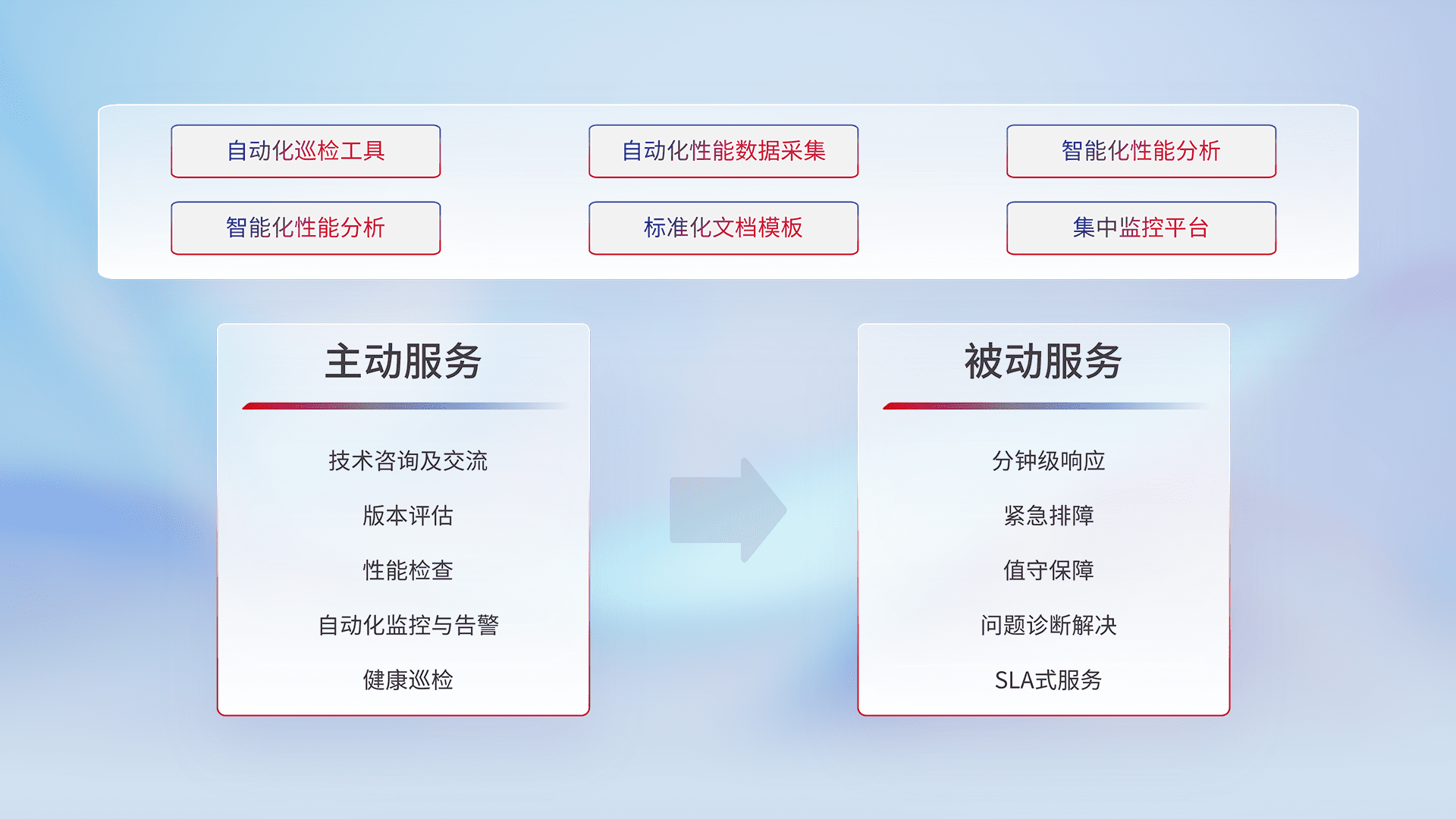智能化工具和标准化文档,,,,保障服务质量,,提供主动服务(包含技术咨询、、版本评估、、、性能检查、、、、自动化监控与告警、、、健康巡检)和被动服务包含(分钟级响应、、、紧急排障、、值守保障、、、、问题诊断解决、、、、SLA服务)。。。。