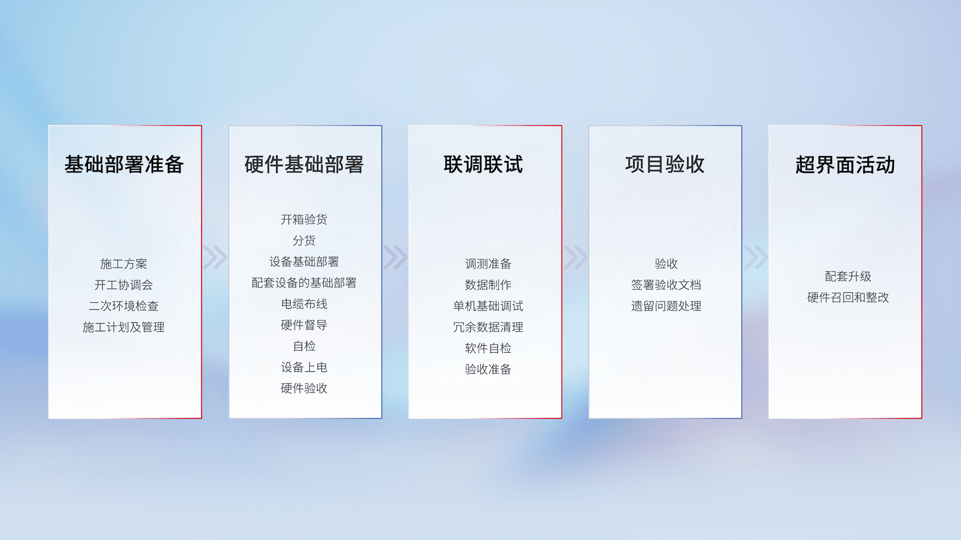 从基础部署准备、、、硬件基础部署、、联调联试、、项目验收、、、越界面活动的全过程可追溯,,,保证施工质量和进度。。。
